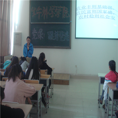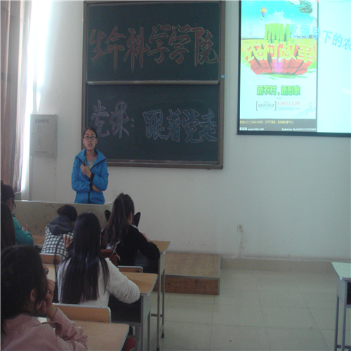 (本报讯张晓芬)为积极推进党建活动,让同学们更好的了解我们的党,努力向党靠拢,生命科学学院于2014年10月15日下午在主楼115开展了党课专题讲座——跟着党走。本次讲座的主讲人为12级学生党员武庚风同志,13级积极分子出席了本次讲座。