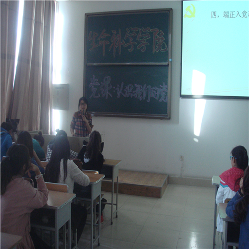 (本报讯张晓芬)为让同学们更好的了解伟大的中国共产党,帮助同学们尽快投入到党的怀抱中,生命科学学院于 2014 年 9 月 24 日下午 在主楼115开展了以“认识我们的党”为主题的党课。本次党课的主讲人为12级学生党员倪洁,13级积极分子和各班优秀学生出席了本次活动。