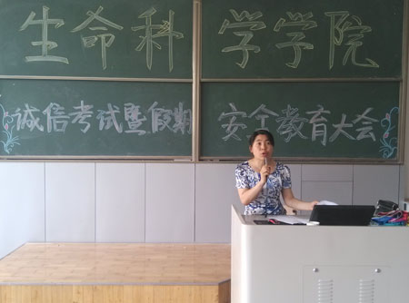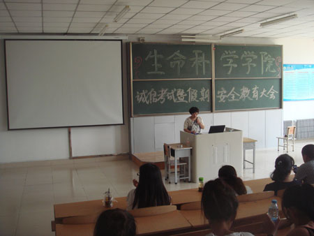 2014 年7月2日 下午,生命科学学院同时在主楼阶梯教室1-1、1-2召开期末诚信考试及假期安全教育大会。生命科学学院11级、12级、13级全体学生以及各班班主任参加了此次会议。会议分别由生物技术系主任武燕老师、生物制药席主任李铭老师主持。