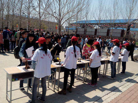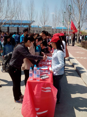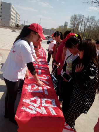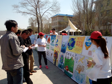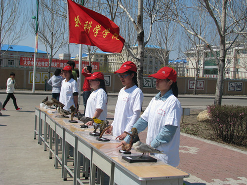 这天阳光明媚、风和日丽。志愿者早早就来到了现场开始了准备工作。为保证“地球日、爱鸟周”宣传活动起到广泛的宣传教育作用,给参与的师生留下深刻的印象,活动当天我们举行了“保护地球,珍惜绿色,爱护鸟类,拥抱自然”为主题的万人签名活动、以“保护鸟类,珍爱地球”为主题的海报展选评比活动、大庆习见鸟类标本展览活动等。海报展选评比活动由观众投票的方式来产生。志愿者还在活动现场拉起了“绿色校园鸟语花香,和谐社会莺歌燕舞”的宣传标语。志愿者们热情地向前来参观教师和各个院系的学生发放了主题为“善待鸟类,爱护地球”的宣传单,并邀请他们在横幅上签下自己的名字,作为对爱鸟护鸟活动的支持。同时,还有专门的同学针对鸟儿的生存环境和生存现状等科普知识向前来观看的老师同学进行详细的讲解。前来观看的学生络绎不绝,活动现场人头涌动,大家对展出的鸟类标本兴趣浓厚,认真地倾听着志愿者的讲解。他们表示将带动身边的人加入到地球保护者的行列中来。