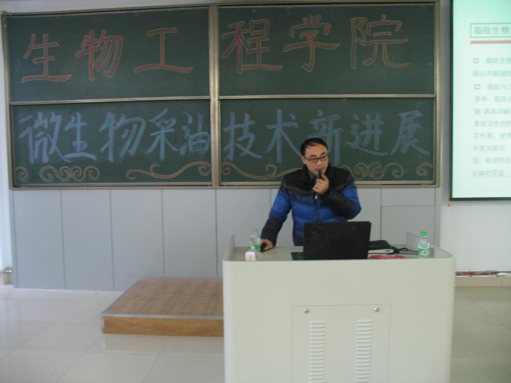 在报告中,沈总首先介绍国内微生物采油技术的现状、大庆华理能源生物技术有限公司微生物采油技术的发展方向,重点介绍了脂肽生物三元复合驱提高采收率技术原理、适用条件、评价标准、矿场试验和应用前景等企业研究和生产实践。罗总主要介绍了当代大学生需要关注的自身成长问题,尤其是学生的学习与沟通。