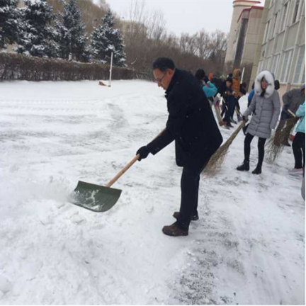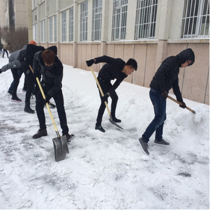 凛冽的寒风吹拂着脸颊,像小刀子割肉一样,疼疼的;天空中的雪花仍然不依不饶的下着。校园的道路,都被厚厚积覆盖着。寒冷和积雪向我们发出了挑战!为了尽快清除积雪,打通道路,给同学们上课提供安全,给教师们上班提供方便,为了保证教学秩序有序进行,我院的“先锋们行动”起来了。冒着严寒,顶着雪花,热情的我们开始了扫雪活动。同学们有的拿着铁铲、铁锹、扫帚等扫雪工具,在徐长君书记的带领下,每一个人都积极地投入到了清雪的活动中。虽然雪比较厚,天气比较冷,但每一个人都很努力,呼出的气体,凝成了一团团雾,脸上挂上了一层霜。一锹锹、一铲铲,雪线退却了,道路打通了。飘扬在空中那洁白的雪花映照着一张张因劳动而红扑扑的脸。在劳动的过程中,大家互相关心,互相帮助男同学积极抢先,女同学不甘落后。清雪活动充满了欢乐,充满了温馨。幸福洋溢在每个人“先锋们”的脸上。