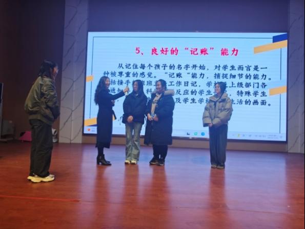 本次见习大庆三中采用“领导讲课,名师指导”带教的方式。指导老师通过课堂教学以身示范,展示师德实践,组织班级活动,并且耐心分享工作经验,交流教学理念,及时答疑解惑,引导见习同学更好地了解和体验教师的素养需求、职业操守和师德规范。首先,由大庆三中政教处张建飞主任做“师德师风 如何践行”的专题讲座,副校长刘鋆星结合自身的班主任工作经验对班主任应该具备的素质和能力进行了生动的讲解,期间学生兴趣盎然,互动频繁,学院副院长曲丽娜总结发言。
